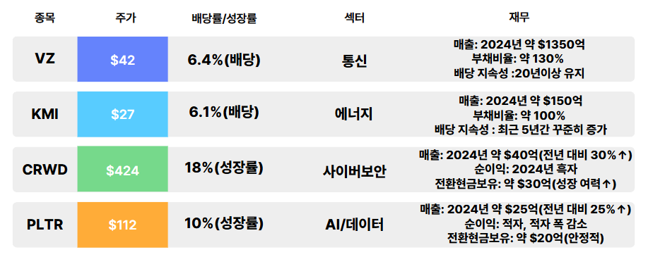 특히 통신(VZ)과 에너지(KMI) 섹터가 안정적으로 주목받고 있어요!