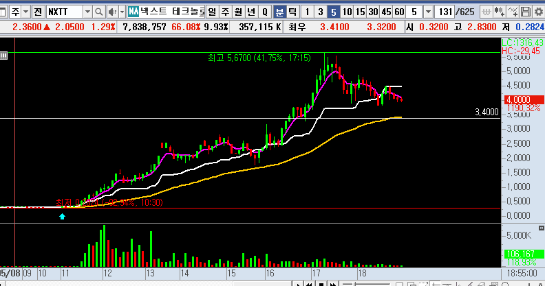 자.. 5.67 달러 까지 올라간 걸로 봐선 역사적 거래량이 터지면서 전체적인 매물소화를 한 장대양봉이 나타났네요